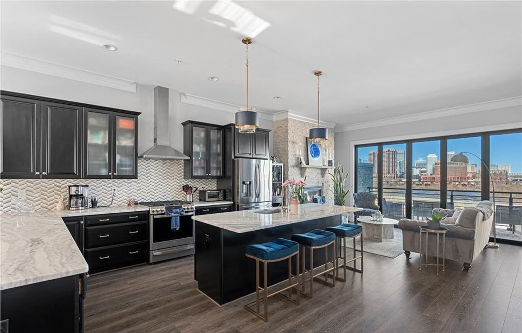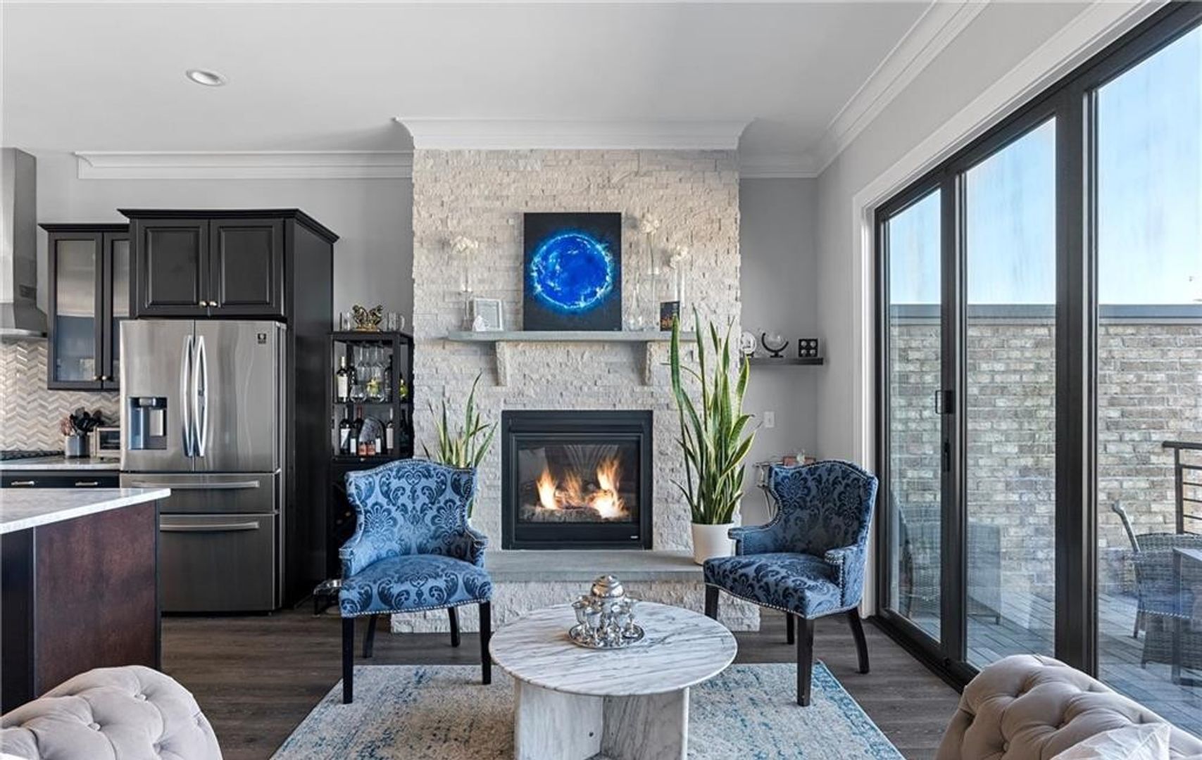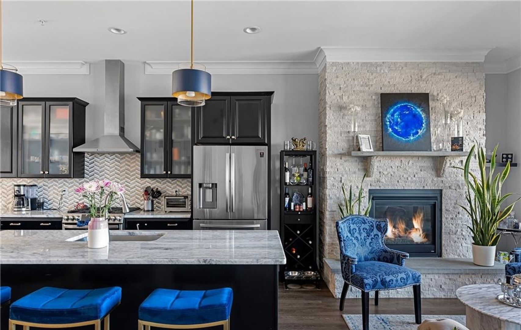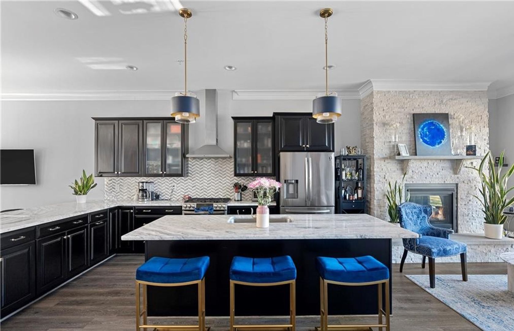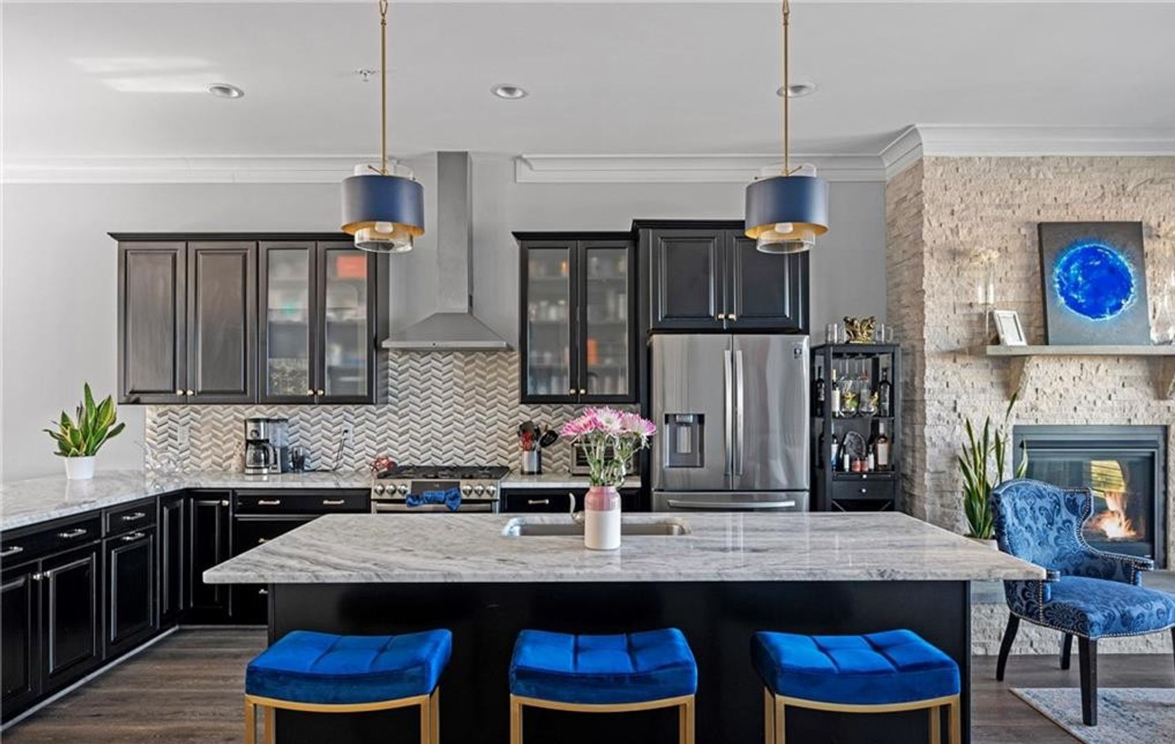 The third floor boasts an open-concept living space with 10-foot ceilings, a striking stone fireplace, and a chef’s kitchen complete with Augusta marble countertops, stainless steel appliances, and combo oven—perfect for entertaining.