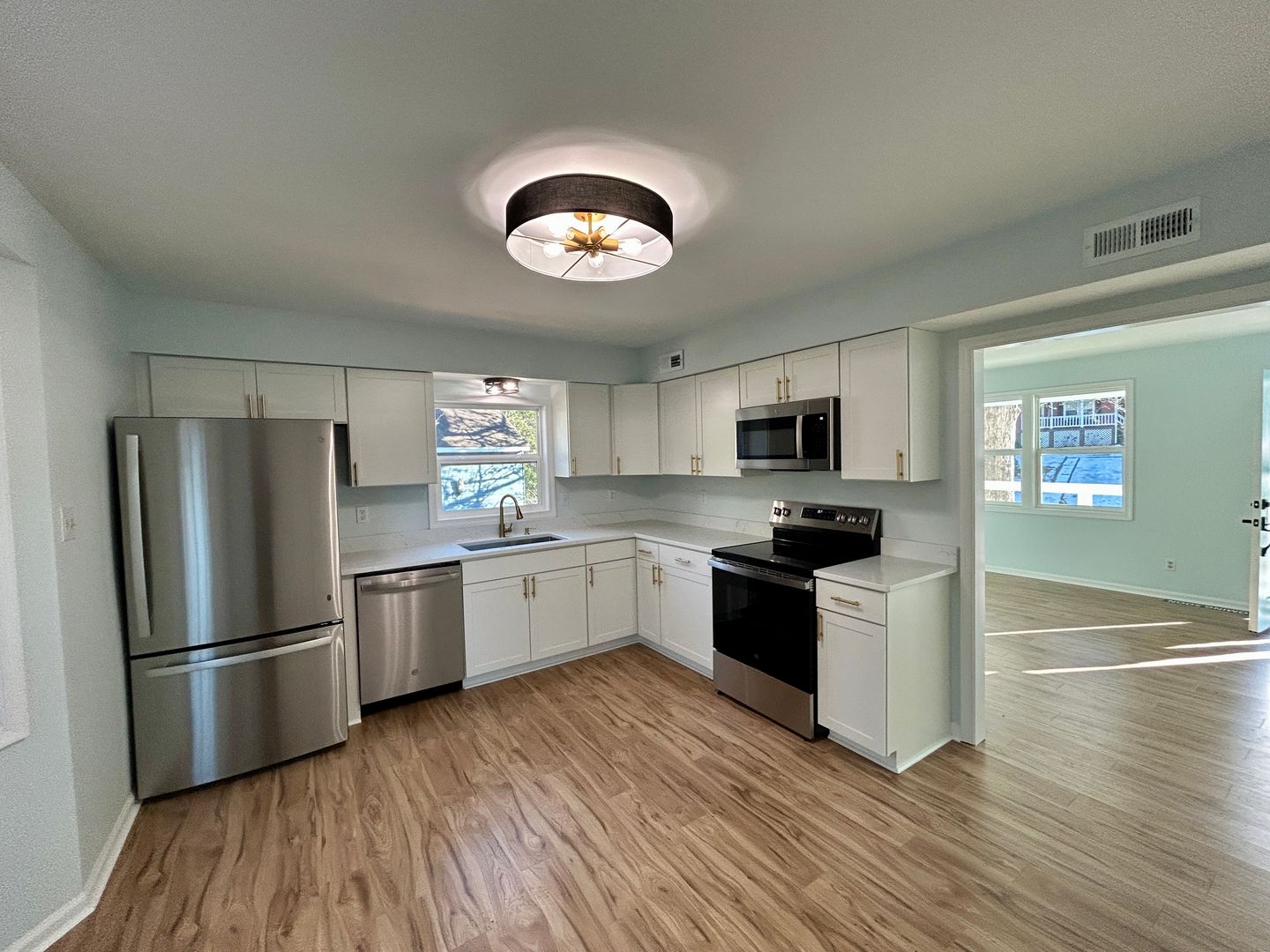Inside, enjoy durable luxury vinyl plank flooring and fresh paint throughout. The fully updated kitchen features timeless white cabinetry, quartz countertops, and brand-new stainless steel appliances. Convenient laundry area is located just off the kitchen - washer/dryer included.